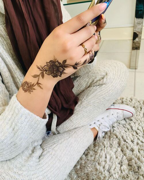37. Delicate Floral Vines Back Hand Mehndi Design with Rose Motifs