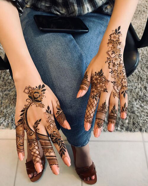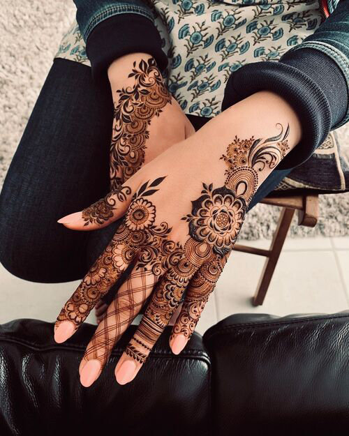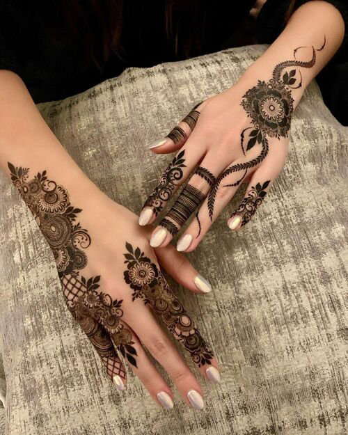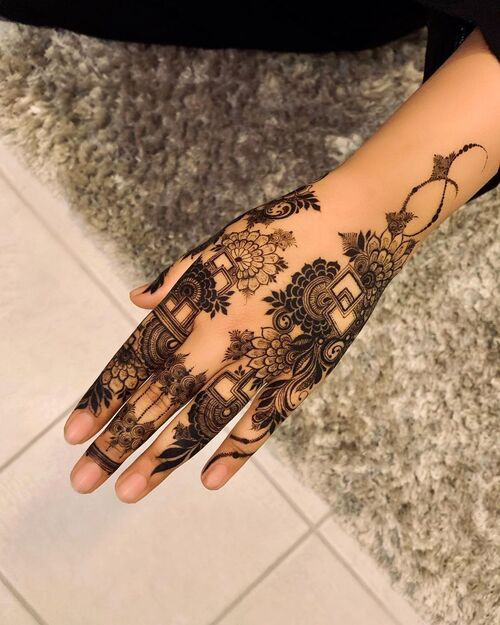 16. Coordinated Back Hand Mehndi Designs with Floral and Geometric Interplay