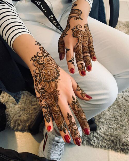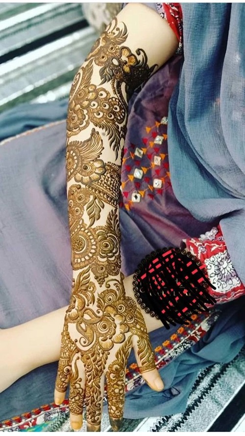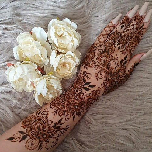 7. Full Coverage Mehndi Design with Dense Floral Detailing