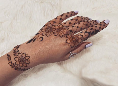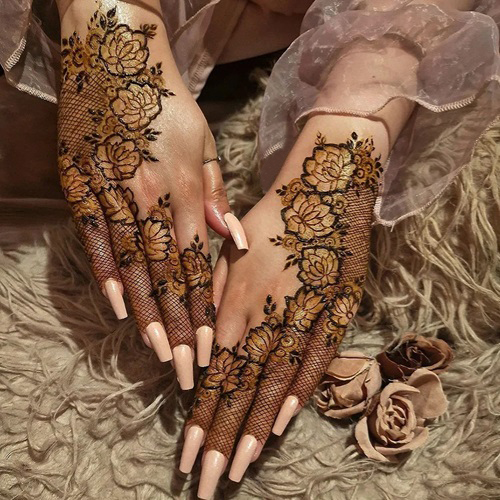35. Hand Mehndi Design with Net Pattern and Floral Highlights
