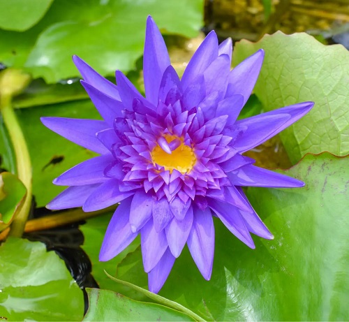 The blue lotus flower or sacred blue lily of the Nile, is a tropical water lily. It boasts day-blooming, star-shaped flowers measuring 4-6 inches across. Each blossom showcases upright, pointed light blue petals gracefully unfurled on the water’s surface.