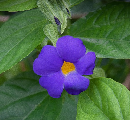 The five petals of this flower come in a charming blue shade with a yellow center. It grows on the hairy stems and offers a wonderful backdrop against the green elements of the garden.