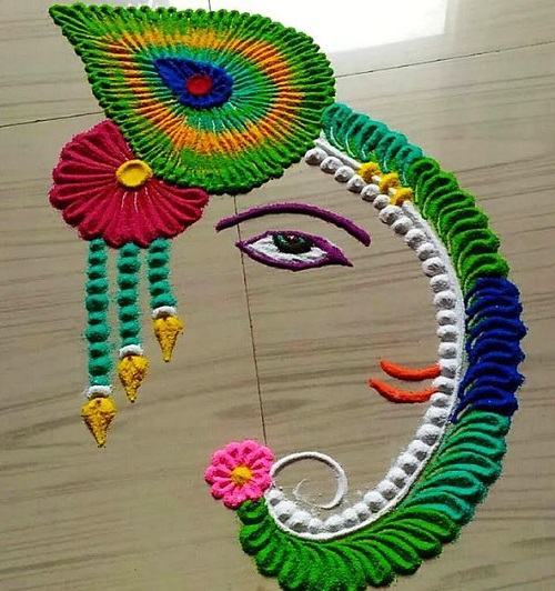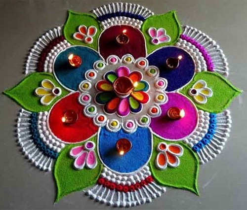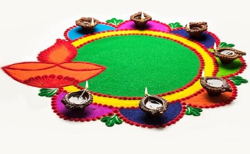 Represents the celebration of life’s colors. Go for the bold and contrasting colors to create an eye-catching Dussehra Rangoli.