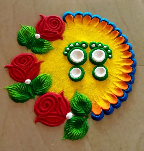 Roses symbolize love and beauty. Create a Dussehra Rangoli making beautiful roses on with small Durga feet on the bright Orange base.