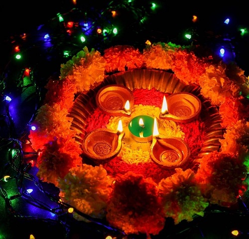 Go with the colorful sunburst pattern using a mix of rose and daisy petals, with a diya at the center which represents the triumph of light over darkness.