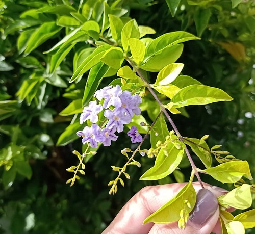 Golden Duranta produces small, lavender-blue flowers in terminal clusters during the warm months. The flowers are followed by small, spherical, yellow, or orange berries that contain seeds. It’s important to note that Duranta repens berries are toxic if ingested, so keeping the plant out of reach of children and pets is advisable.