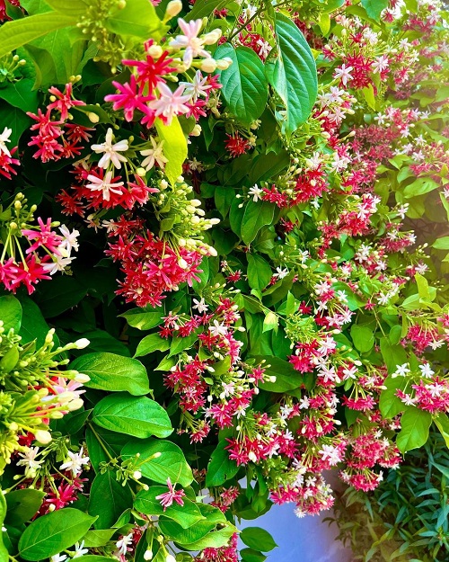 Madhumalti is a flowering vine, known for its fragrant flowers that change color as they mature, starting as white, turning pink, and then eventually dark red. Madhumalti is often grown as an ornamental plant due to its attractive flowers and ease of care.