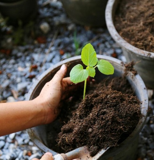 - Plant one okra seed in each pot, covering it with about 1/2 inch of soil.
